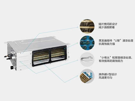 厨享内机采用金色防腐翅片换热器,抗腐蚀能力强,翅片采用宽间距设计,可减少油烟附 着:换热器采用V型设计,使风速更均匀。